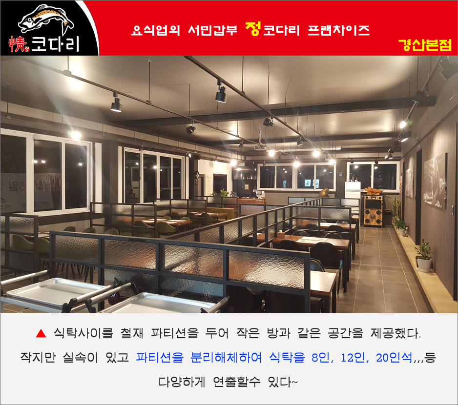 정코다리 체인본부에서 드리는 혜택 1정 - 기존 상점 인테리어를 최대한 활용한 체인점 가능. 2정 - 자체 인테리어 시공도 가능하고 본사 시공시 국내 최저가, 최고 인테리어 연출. 3정 - 가맹비, 교육비 전액 면제. 4정 - 안정된 물품조달 및 최저가 재료 납품. 5정 - 체인점 권리보호 및 매출증대를 위한 공동홍보활동.